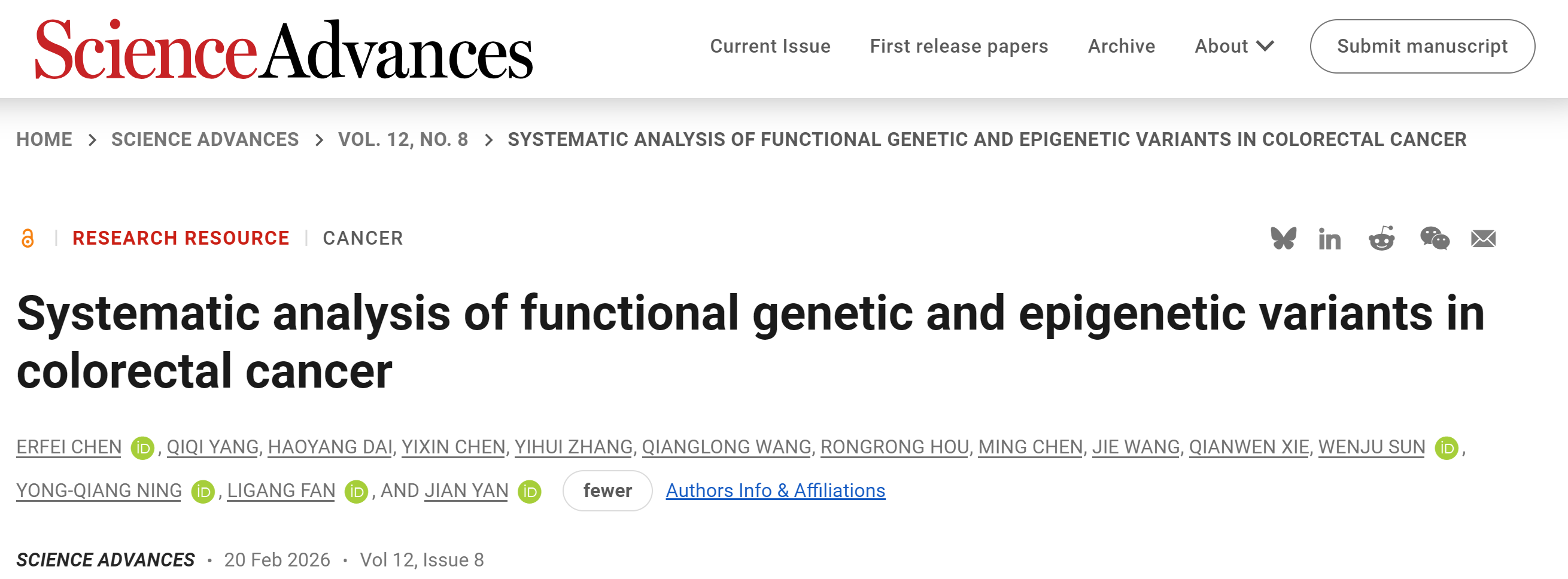 2026年2月20日,qy球友会生命科学与医学部严健教授团队在Science Advances上发表了题为“Systematic analysis of functional genetic and epigenetic variants in colorectal cancer”的研究论文。该研究构建了一套整合性功能基因组学流程,首次在原发性与转移性结直肠癌细胞中,系统揭示了非编码SNP与CpG甲基化对增强子活性的调控网络,为理解结直肠癌的发病与转移机制提供了全新视角。